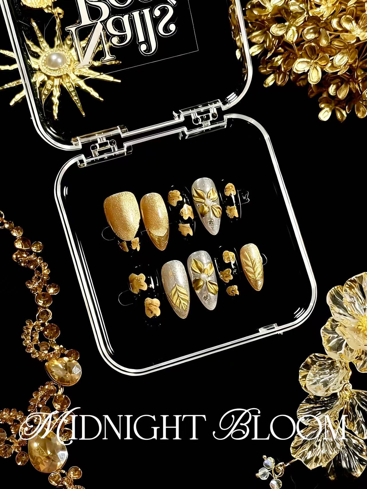 Midnight Bloom captures the essence of nocturnal elegance with its sophisticated color palette. Light almond provides a luminous base that brightens the nail, while deep rose florals add romantic depth and dimension. Golden accents catch the light beautifully, creating subtle shimmer and luxury. This expertly curated combination delivers a refined, versatile look suitable for both everyday wear and special occasions. The interplay of warm and cool tones ensures a flattering appearance on all skin tones.