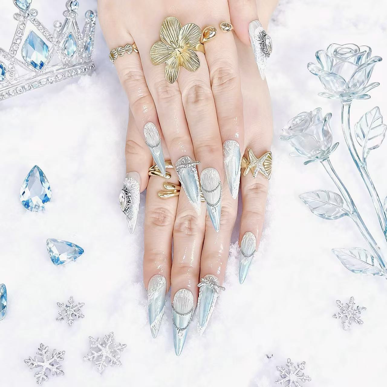 Ombre Moonlight offers a sophisticated gradient design blending delicate light blue hues for a serene and elegant look. Expertly crafted to highlight the natural shape of your nails, this style enhances length and definition while maintaining a soft, luminous finish perfect for any occasion.
