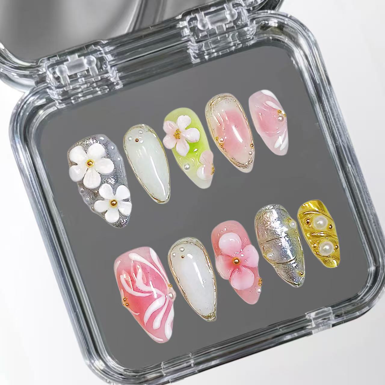 The Peach Fantasia design pairs a delicate light pink base with refined silver and gold accents, creating an elegant contrast. Highlighted by intricate floral detailing, this style embodies sophistication and subtle luxury. Perfect for those seeking a timeless yet modern look, Peach Fantasia enhances nail artistry with its balanced blend of soft hues and metallic shimmer.