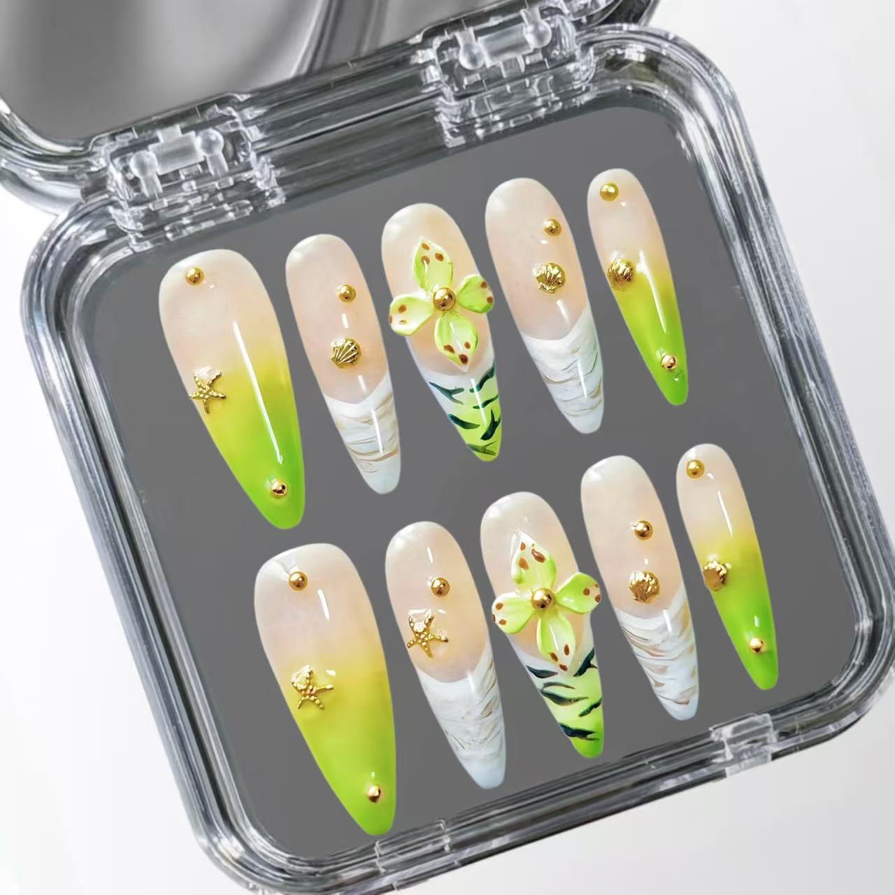 Elevate your nail game with the Sage Blossom press-on nails, featuring a sophisticated light green hue and an elegant long shape. Designed for a flawless fit and easy application, these nails provide a durable, salon-quality finish without the hassle. Perfect for those who appreciate subtle yet fresh color tones with a modern silhouette, Sage Blossom offers both style and convenience for a polished look anytime.