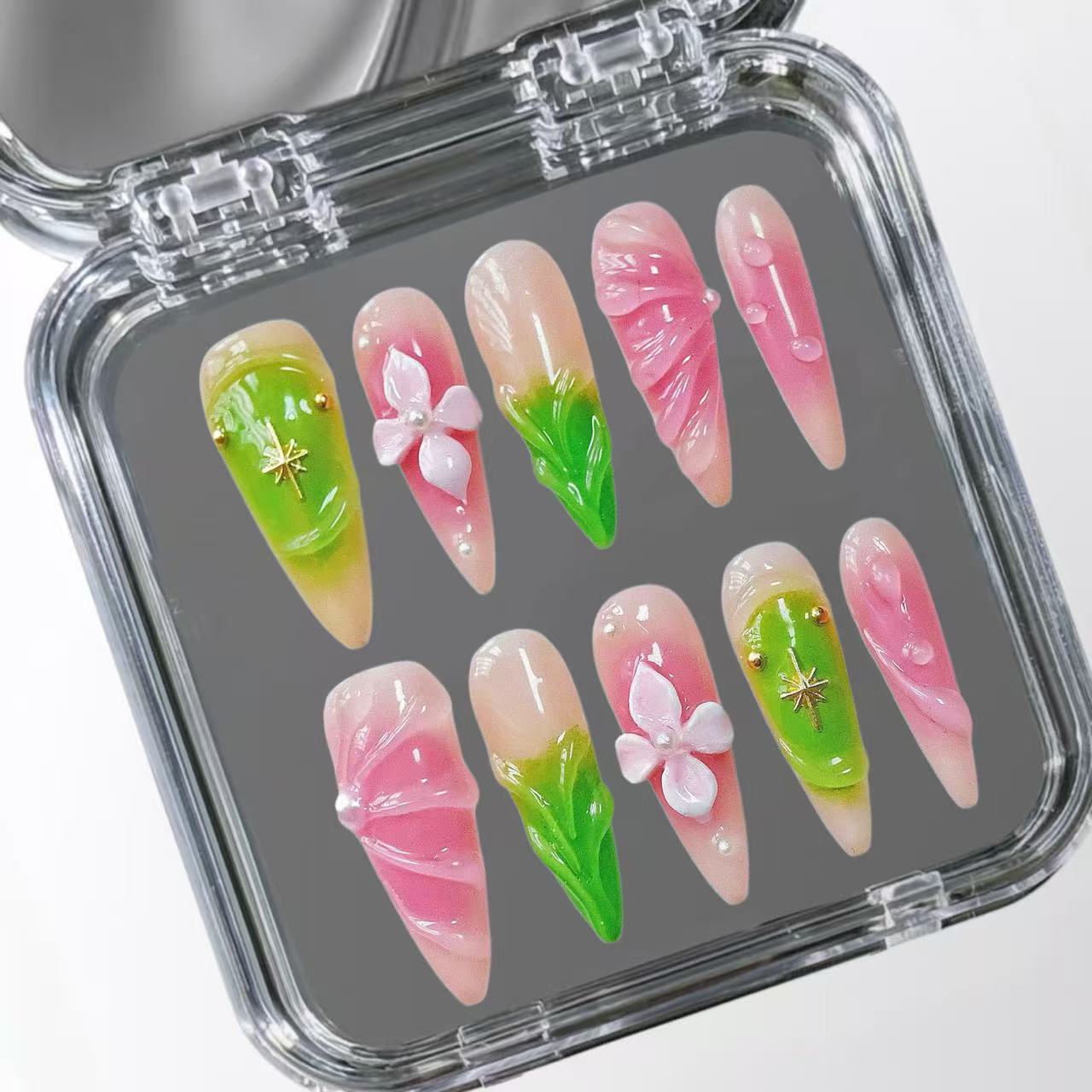 Embrace the essence of renewal with Spring Dreamscape, featuring delicate shades of soft pink and fresh green inspired by blooming flowers. This design captures the gentle vibrancy of spring, offering a refined and natural look perfect for those seeking a subtle yet sophisticated style. Ideal for enhancing your nail art with a fresh, floral touch that evokes the serene beauty of a blossoming garden.